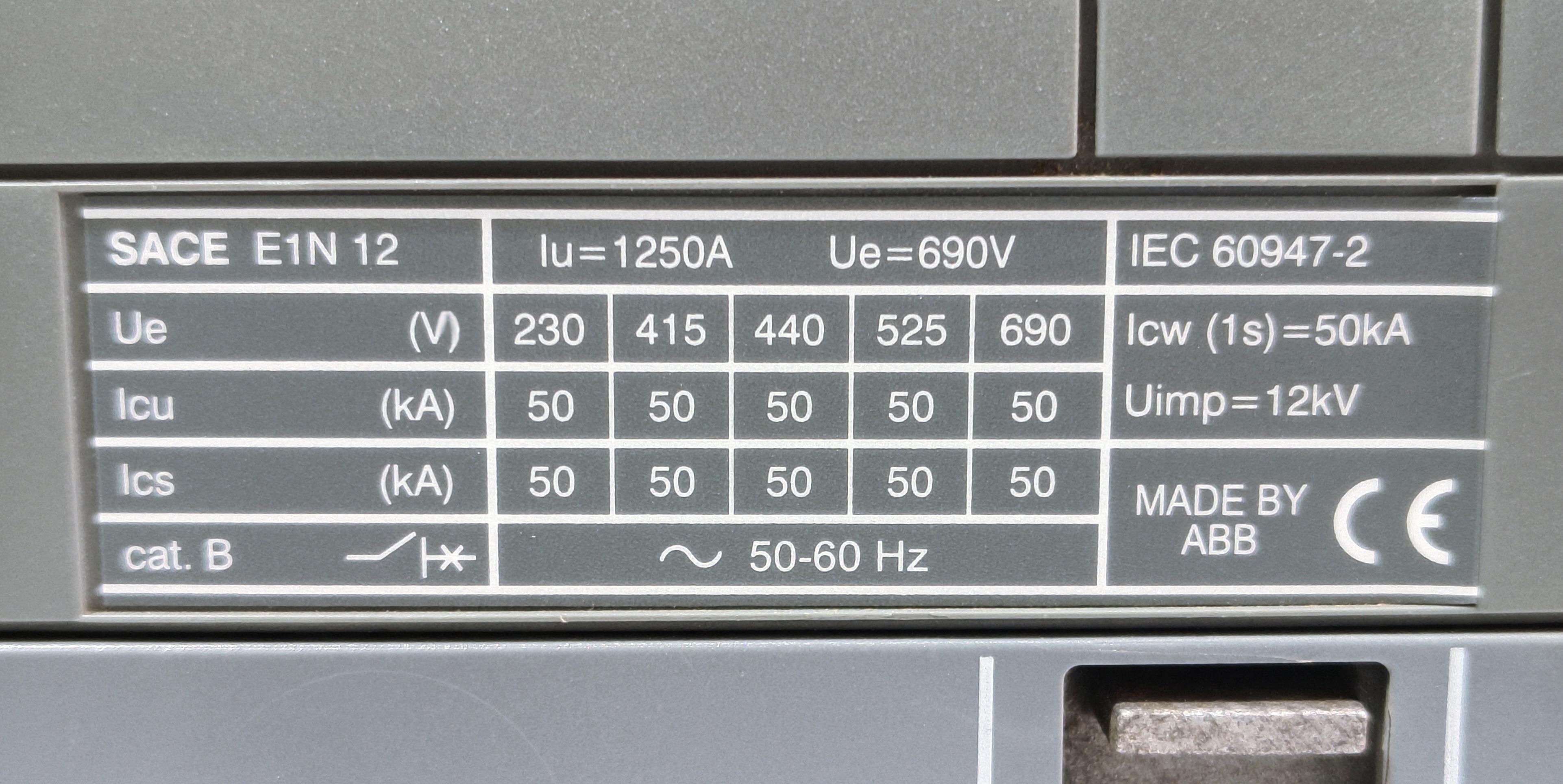 ABB SACE E1N 12 PR121/P AIR CIRCUIT BREAKER 1250A 3 POLE 12kV 220-240V