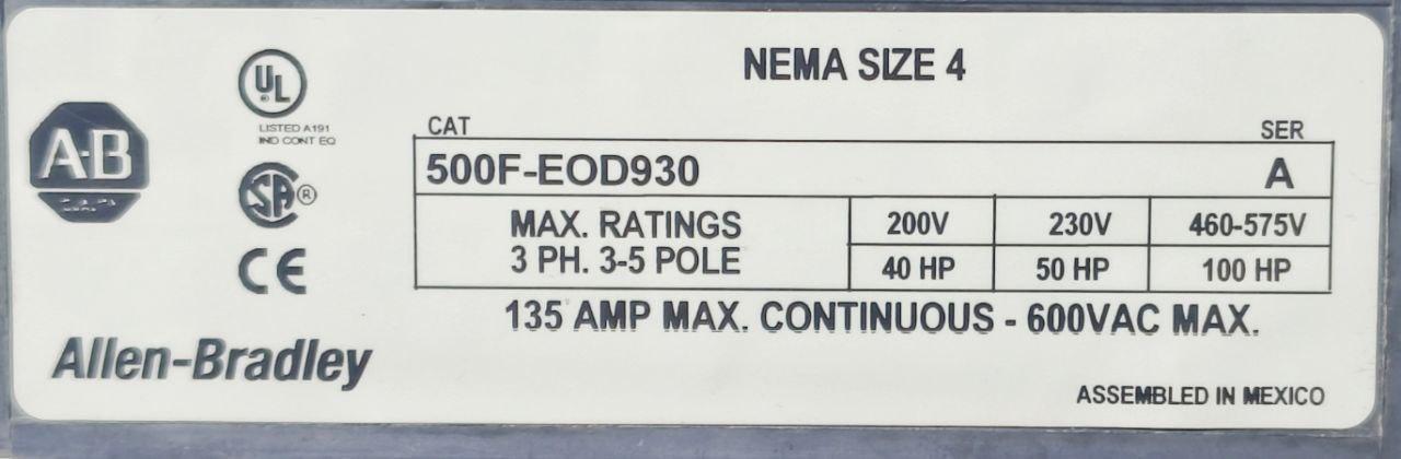 ALLEN BRADLEY 500F-EOD930 NEMA SIZE 4 AC CONTACTOR 3 POLE 115-120VAC 135A 100HP