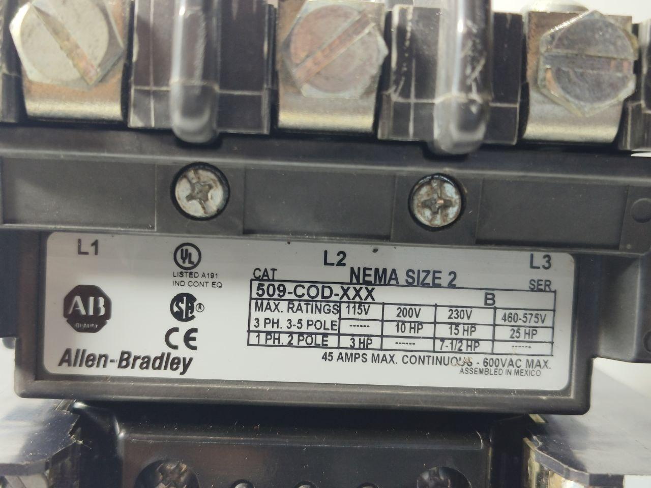 ALLEN BRADLEY 509-COD-XXX SER B NEMA SIZE 2 CONTACTOR 110-120V WITH RELAY 9-45A