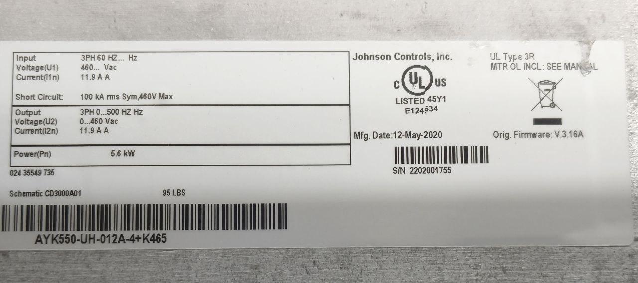 JOHNSON CONTROLS AYK550-UH-012A-4+B055+K465 5.5KW / 7.5HP 11.9A INVERTER DRIVE
