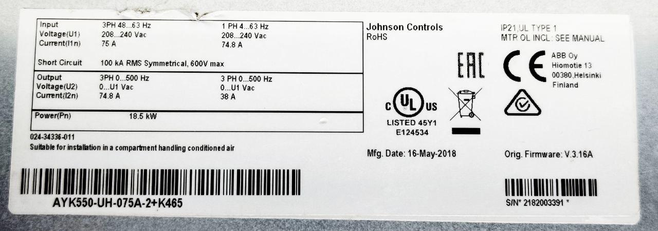 JOHNSON CONTROLS AYK550-UH-075A-2+K465 18.5KW / 25HP 75A 208-240 V AC DRIVE