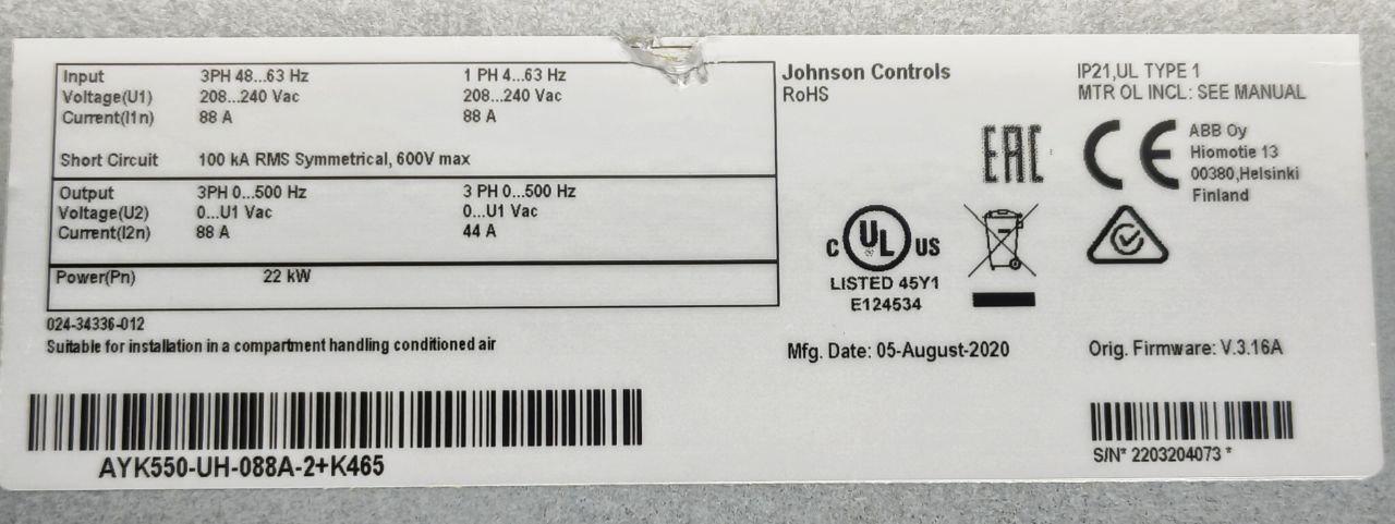 JOHNSON CONTROLS AYK550-UH-088A-2+K465 22KW 3 PH 240VAC VARIABLE FREQUENCY DRIVE